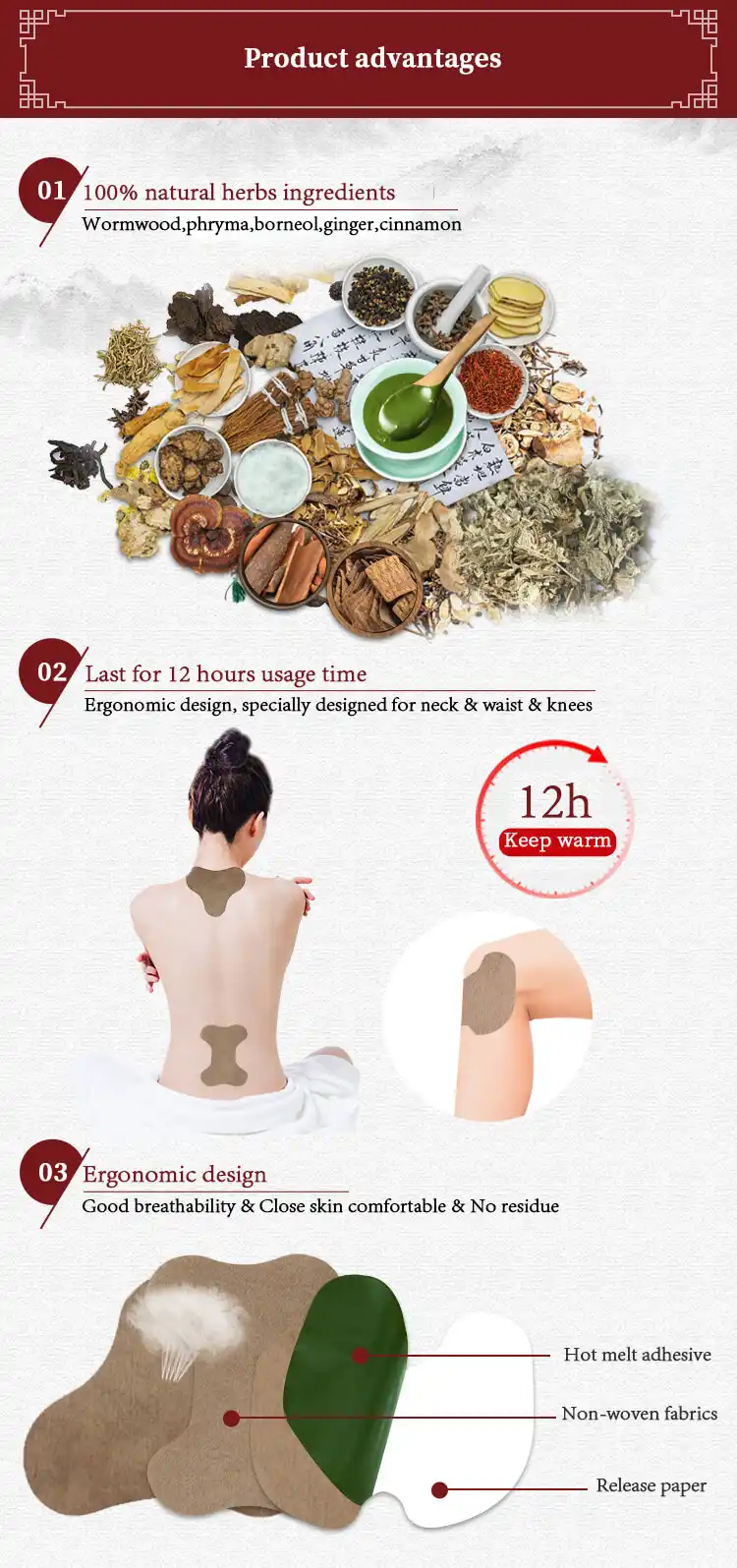 Our Knee Pain Relief Patch is designed to provide deep, soothing relief for knee pain, arthritis, and stiffness. Infused with natural herbal extracts and heat therapy, it helps improve blood circulation, reduce inflammation, and ease muscle tension in the knee area. The skin-friendly, breathable material ensures comfort, and the patch delivers up to 12 hours of continuous relief, making it perfect for daily use.